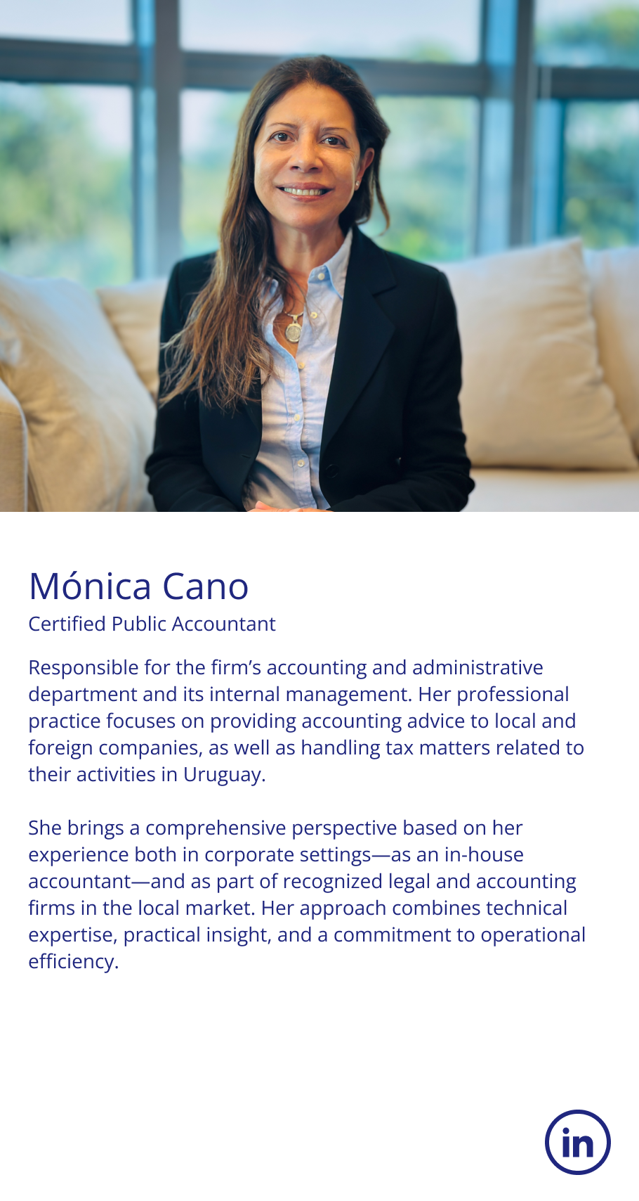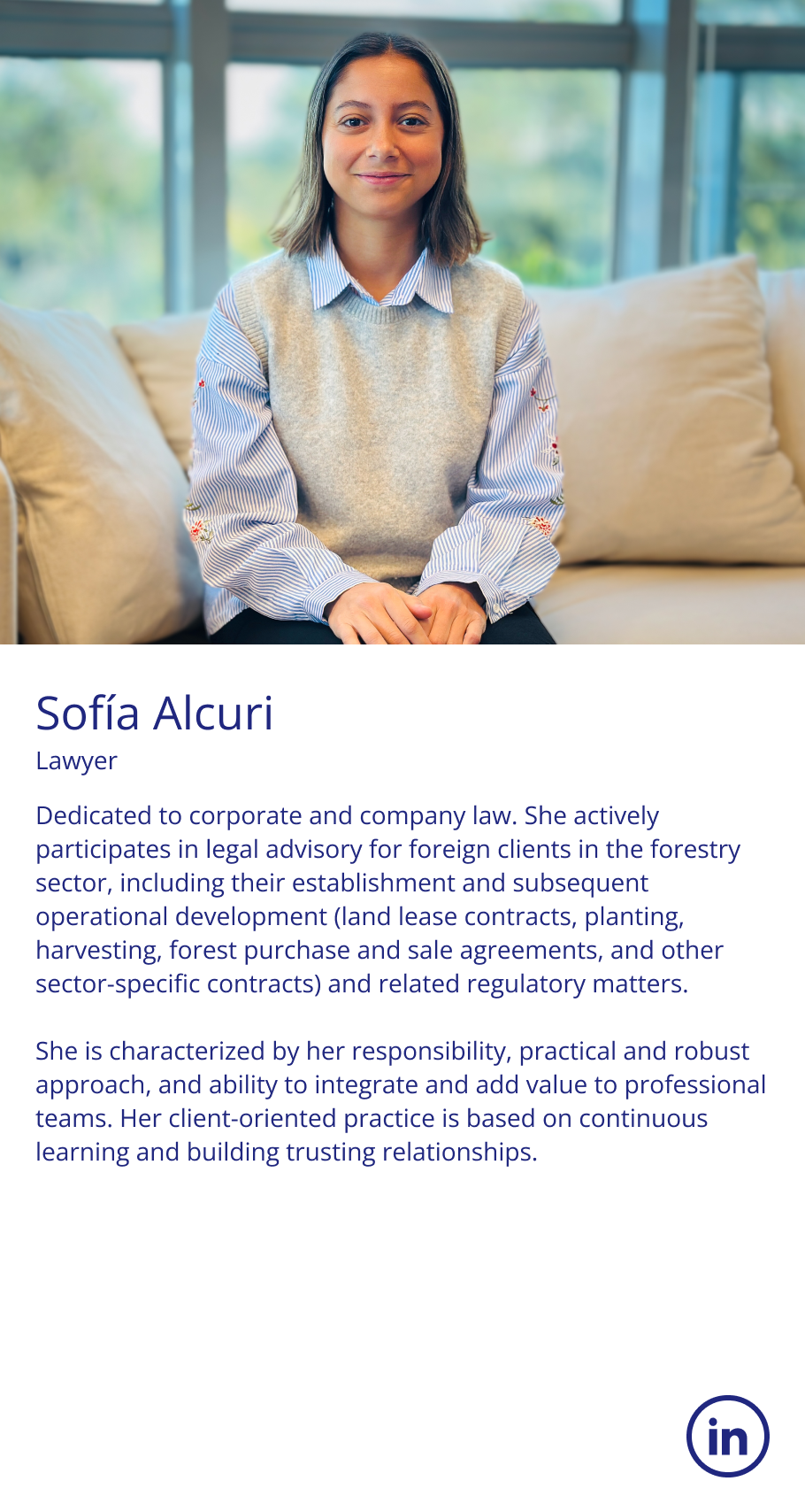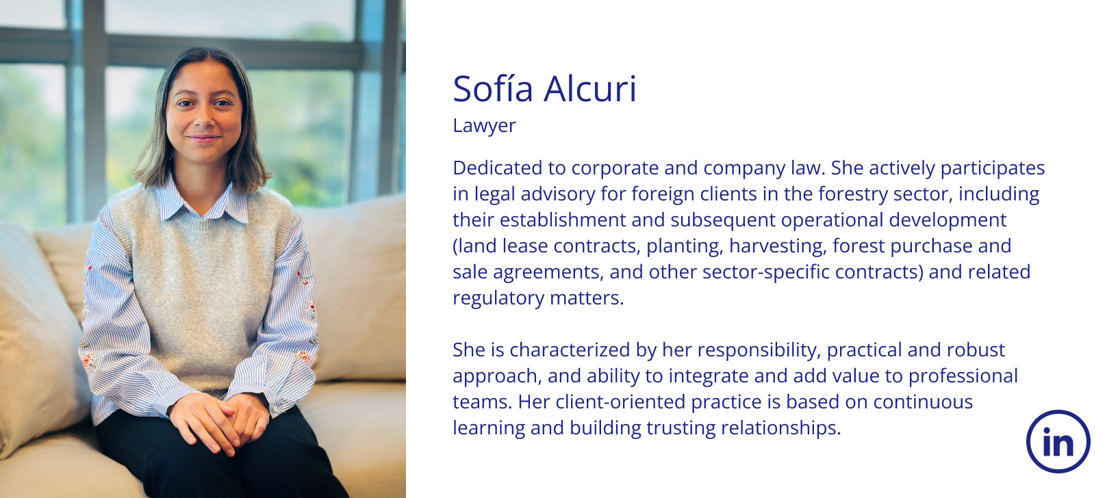 She has participated in some of the largest forestry investment transactions in Uruguay. Her client-centered approach leverages a mindset of continuous learning and curiosity to stay at the forefront, working with awareness and responsibility to provide excellent advice.