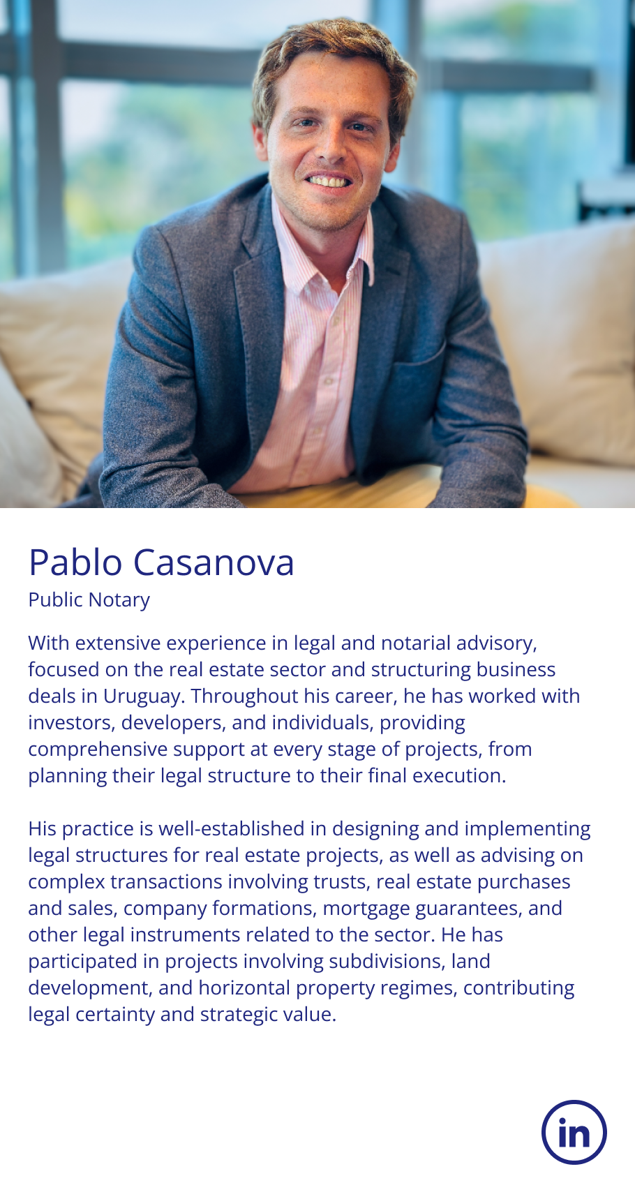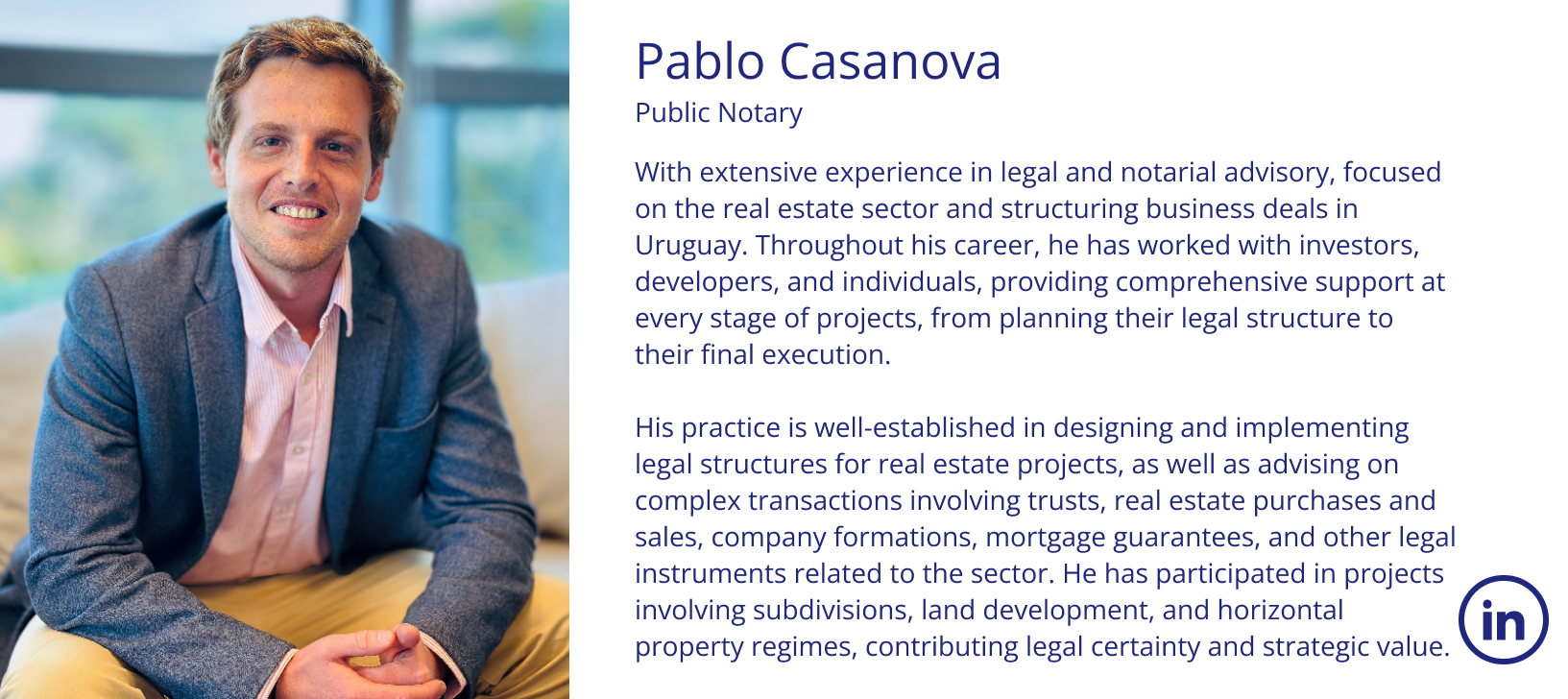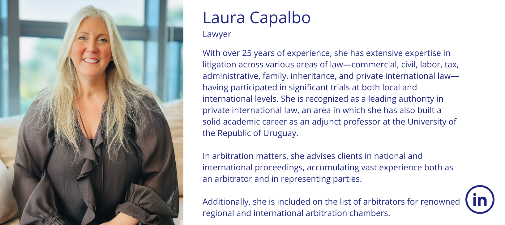 In corporate matters, he has participated in mergers and acquisitions of commercial, industrial, and financial companies, excelling in general legal practice and personally assisting clients at various stages of their business activities. Throughout his career, he has been a partner at prominent Uruguayan law firms, currently maintaining a highly personalized practice with exclusive dedication to the firm’s clients.